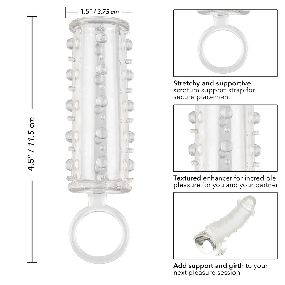 The Sensation Enhancer is a super tight, open-end extension sleeve with a sensually beaded shaft. The super-sized enhancer wraps tight around your pleasure tool to increase girth, length and pleasure. While you thrill your lover with increased girth and stimulating beads, the fulfilling enhancers powerful erection support and open-end design results in explosive results for both of you. The erotic enhancer sleeves ultra-stretchy material and the spacious chamber is made to fit even the biggest man. The textured chamber and built-in scrotum strap provide increase stimulation and powerful support. Wrap your pleasure tool in this super stretchy sleeve to easily increase stamina, stimulation and orgasmic pleasure. The flexible enhancer is made from a hygienically superior TPE. This body-safe material is unscented and phthalate free to keep your most sensitive spots happy and healthy.